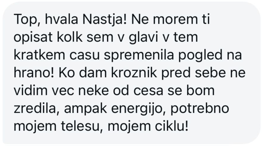 Veliko bolj mi je jasna prehrana in vse ostalo, kar vpliva na cikel in splošno počutje ženske. PMS-ja skoraj ni več in veliko bolje razumem svoje telo.